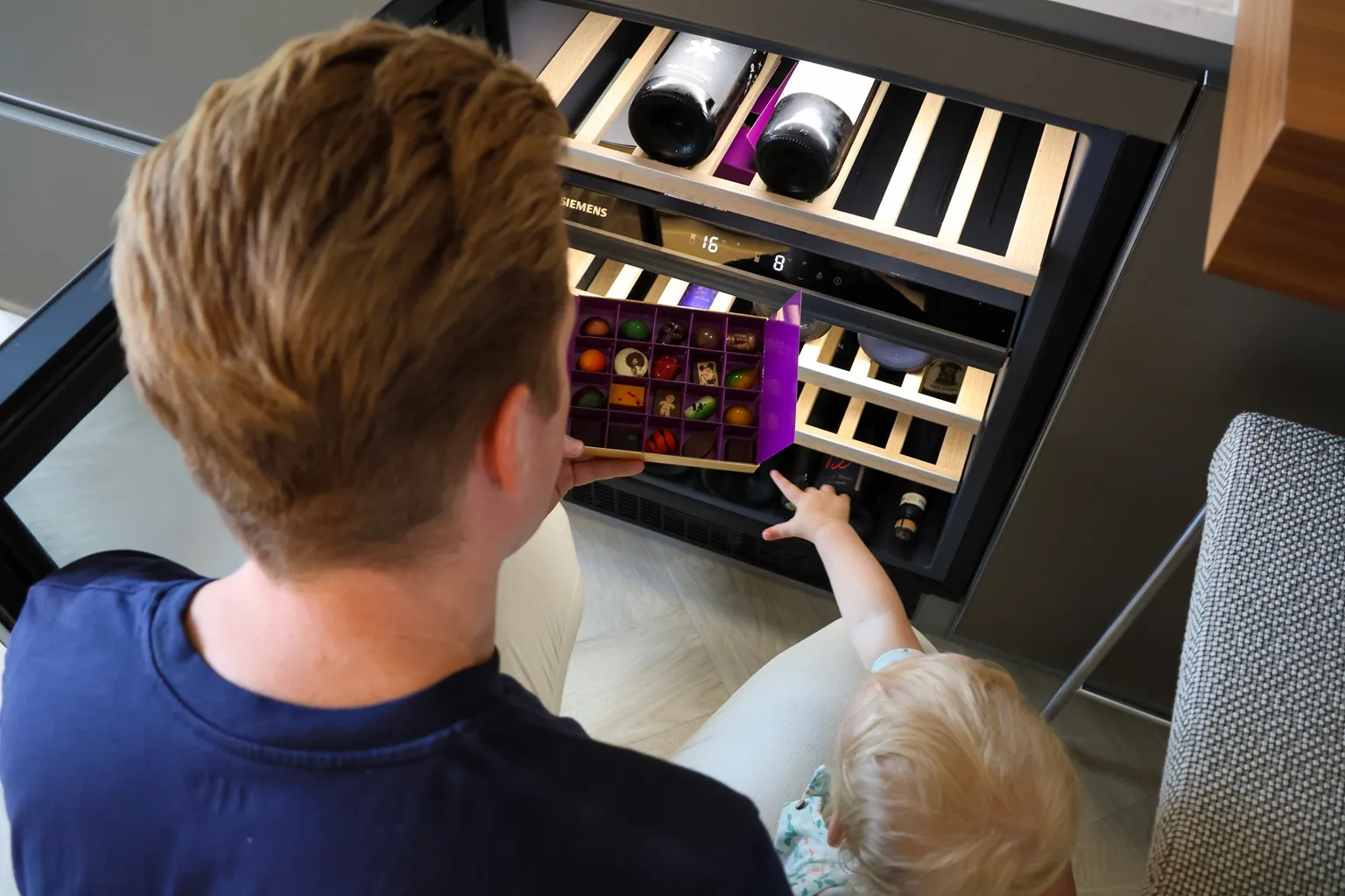 Onze wijnkast heeft twee temperatuurzones: één voor rode en één voor witte wijn. Een leuk extra detail: we gebruiken de rode wijnzone ook voor chocolade. De temperatuur is hiervoor perfect – niet te warm, maar zeker ook niet te koud. Geen zachte, smeltende chocolade meer, maar altijd knapperig en precies goed om van te genieten.