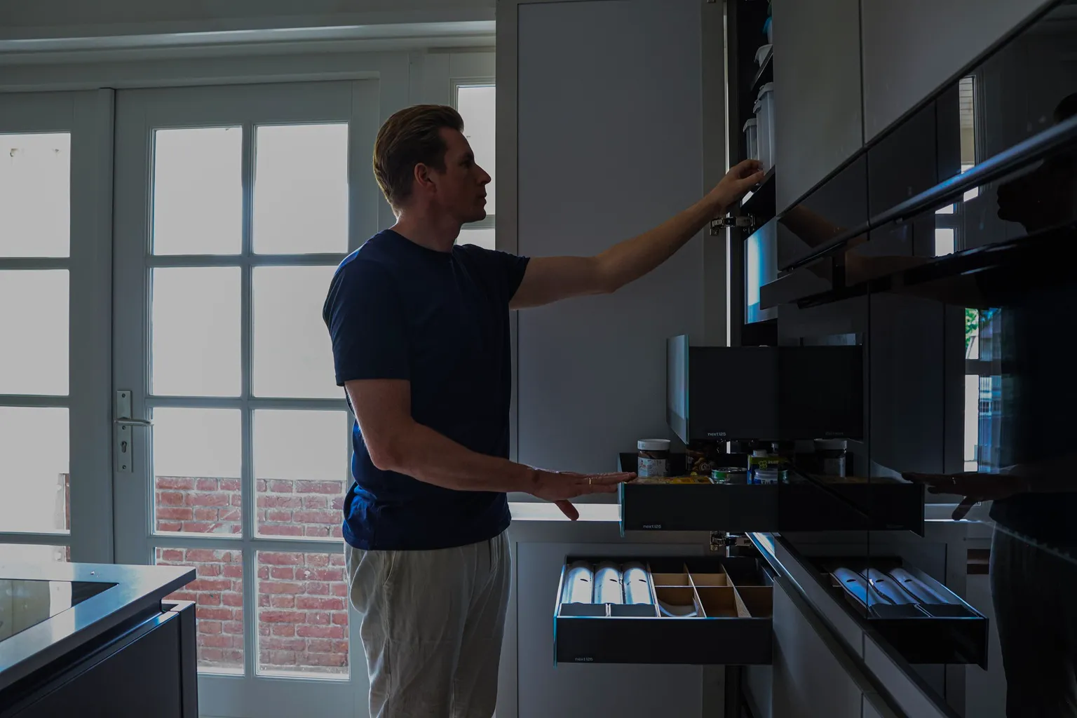 De deuren, laden en panelen van matglas zijn echte blikvangers. Ik had nooit gedacht dat glas in een keuken thuis zo’n warme, chique uitstraling kon hebben. Toen we ze zagen, wisten we meteen: dit willen we. Natuurlijk dacht ik: “Hmm, met een kleintje misschien niet ideaal…” Maar het schoonmaken gaat zó snel dat dit geen enkel probleem is. En eerlijk? Het geeft dat exclusieve gevoel dat u normaal alleen in luxe woonmagazines ziet.