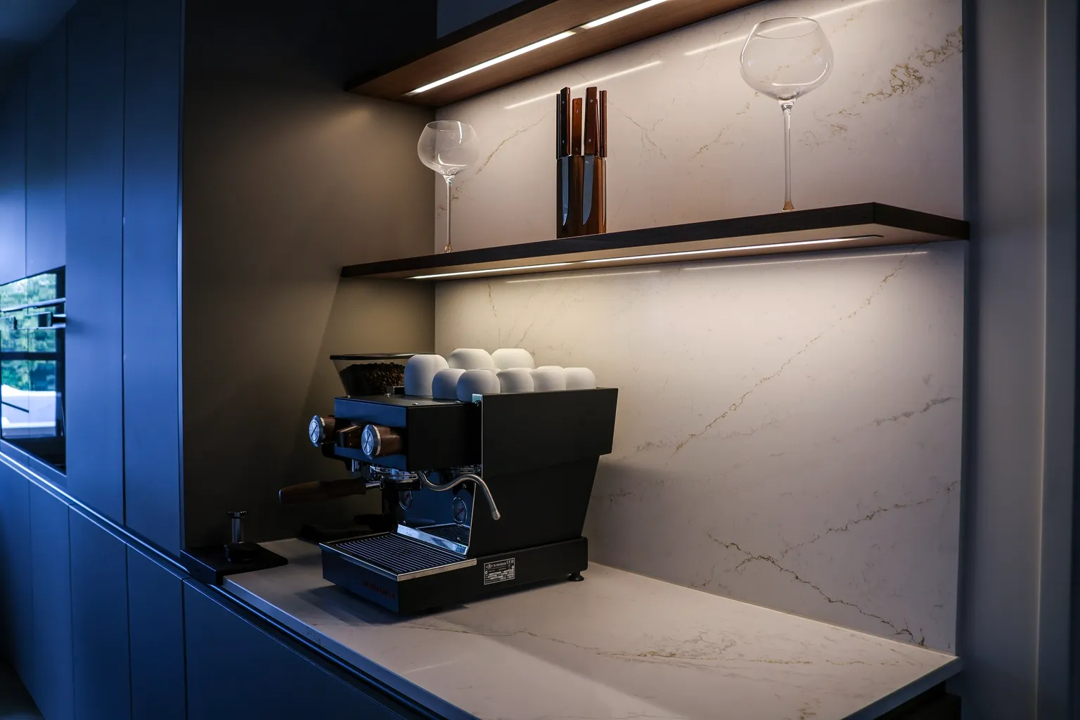Ons barblad en de planken zijn gemaakt van walnotenhout, en dat doet wonderen voor de sfeer. Het hout is donker, warm en straalt karakter uit. Extra tip: de verstelbare LED-strip maakt het verschil. Overdag helder en energiek, ’s avonds zacht en sfeervol. Voeg drie handige stroompunten toe in het barretje, en u hebt de ultieme combinatie: werken, koken of een laptop erbij terwijl u koffie drinkt – alles kan zonder gedoe.